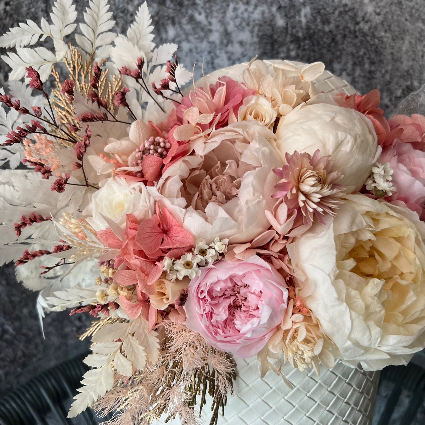 Flower box with mix Preserved flowers are the perfect way to bring a touch of beauty and elegance to any home or office. These amazing long lasting real flowers will stay looking beautiful for up to one - three year, making them a great option for adding a touch of beauty and luxury to any space, will be a great gift for your loved one, Anniversary, Birthday, Mother’s Day ore Valentines Day . With preserved flowers , you can enjoy the beauty of real flowers without the hassle of having to water and maintain. Arrangement is made in the form of an ajar box, trimmed with white eco leather and includes : preserved pink garden roses, cream and ivory preserved peonies and peony bud, pink preserved hydrangea, dry white and pink gypsophila (baby’s breath) , preserved white Italian ruscus, preserved white arachnoids leaves and pink rice flowers.